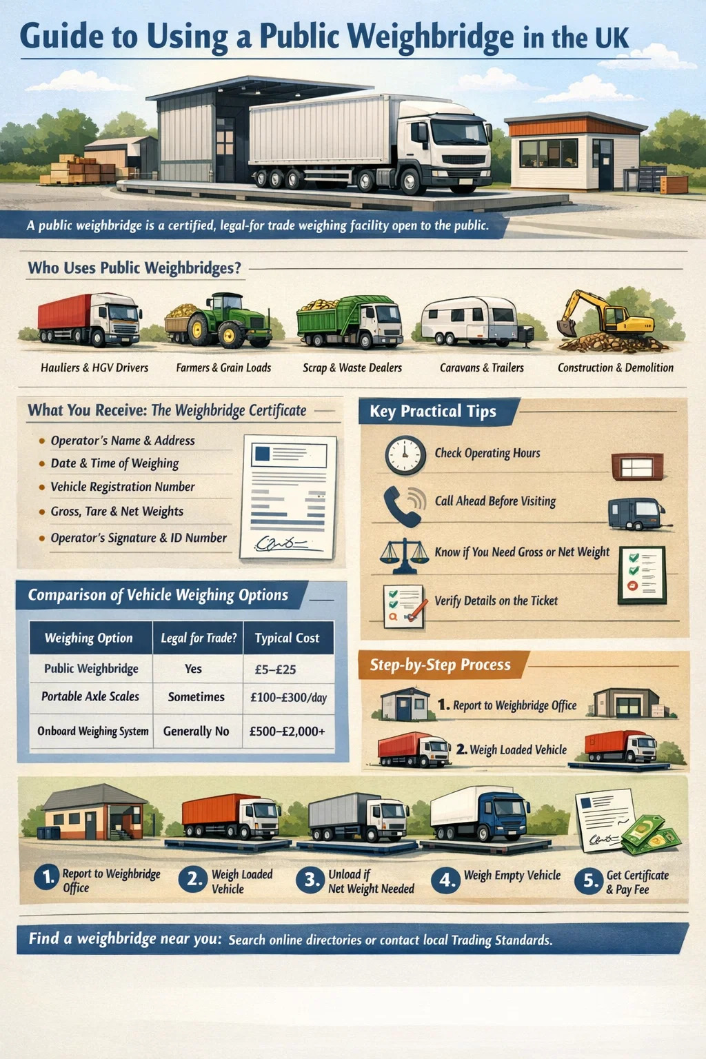 The term "public weighbridge" has a specific legal meaning in the UK under the Weights and Measures Act 1985. A public weighbridge is one that is made available to the public for weighing vehicles and their loads — it must be a verified, legal-for-trade instrument operated by an appointed weighbridge operator. The operator is required by law to weigh any vehicle presented to them during operating hours and to issue a certificate of weighing (the weight ticket) upon request.