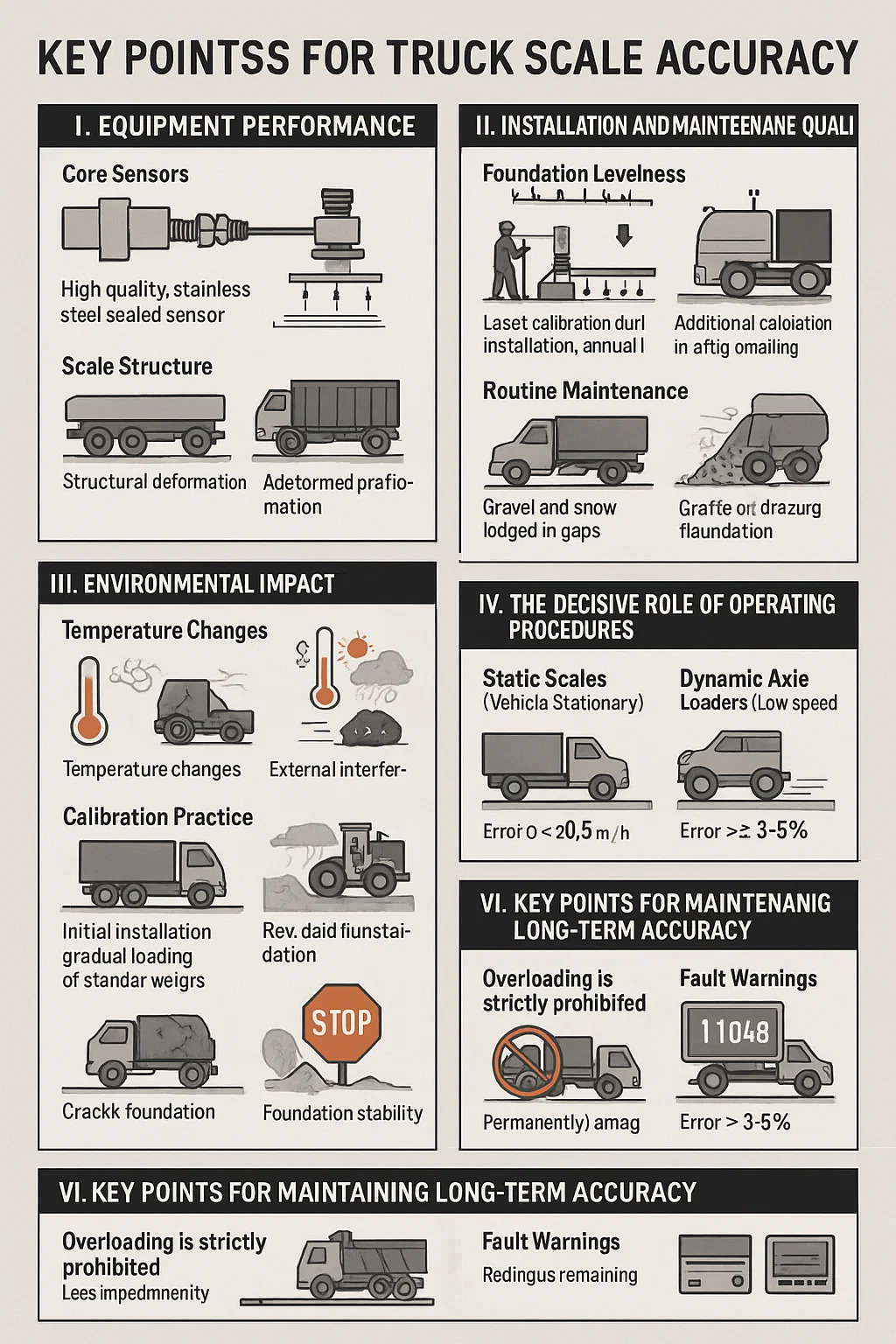 The accuracy of truck scale is affected by multiple factors, requiring a comprehensive assessment of equipment quality, environmental conditions, and operating procedures during actual use. Here are the key points:
