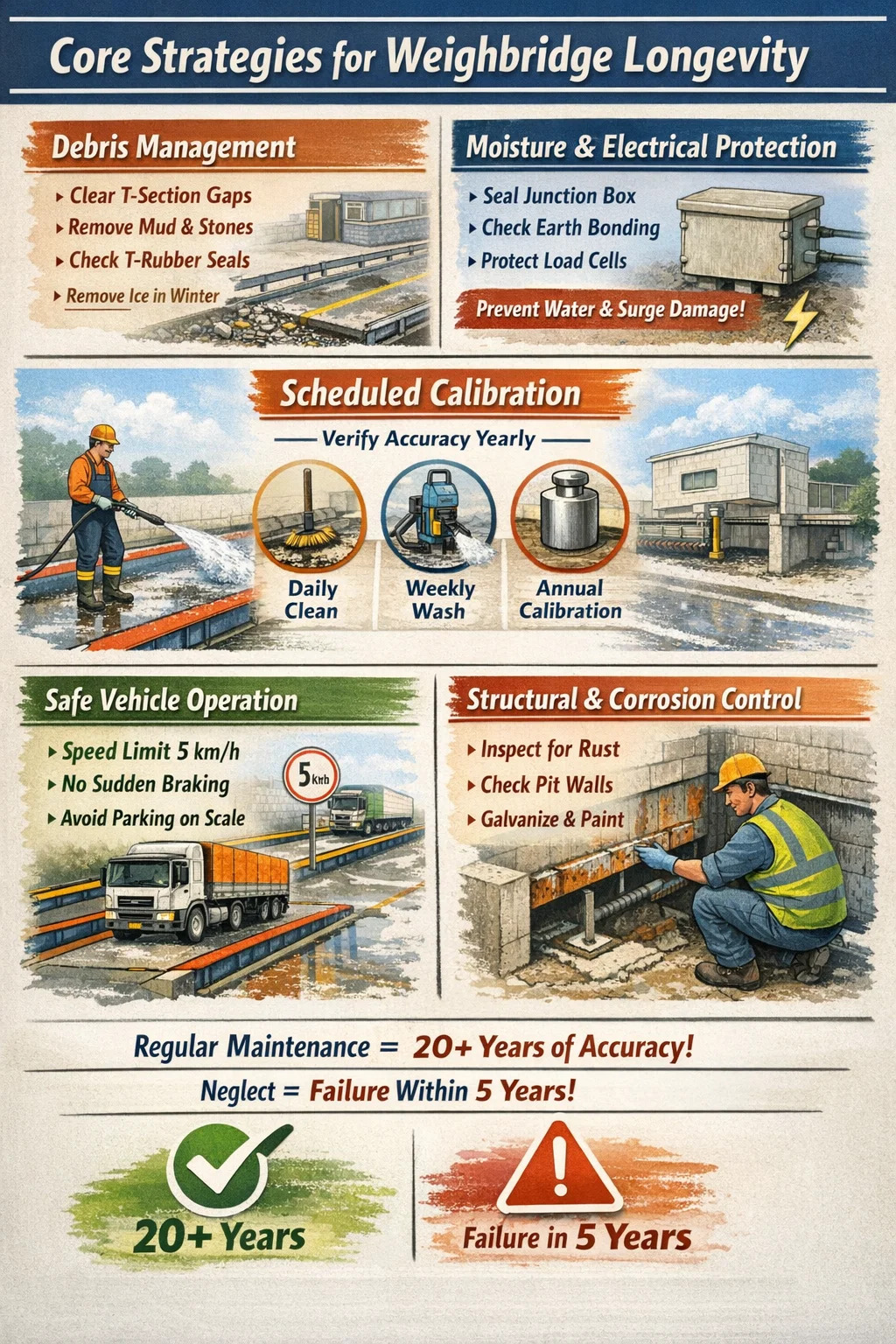 To maintain a weighbridge effectively, you must focus on three primary areas: rigorous debris removal, moisture control around electronic components, and scheduled professional calibration. Regular upkeep prevents measurement errors that can lead to financial losses and legal non-compliance. A well-maintained system can last over 20 years, whereas a neglected one may fail within five due to load cell damage or structural corrosion.