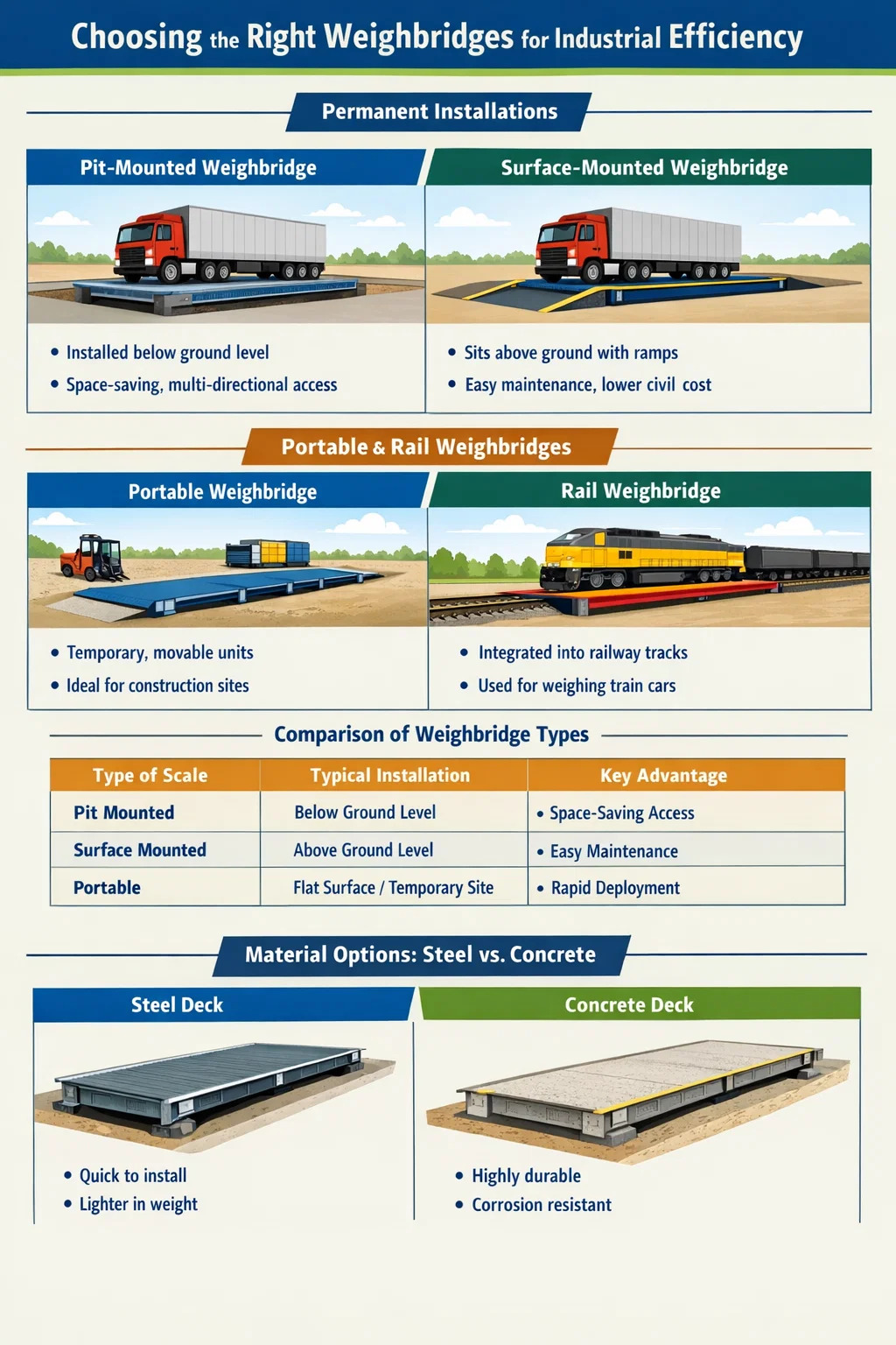 Selecting the correct weighbridge depends primarily on your available space, site conditions, and frequency of use. The primary types are pit-mounted, surface-mounted, and portable weighbridges, each offering distinct advantages for vehicle weight management and cargo verification.