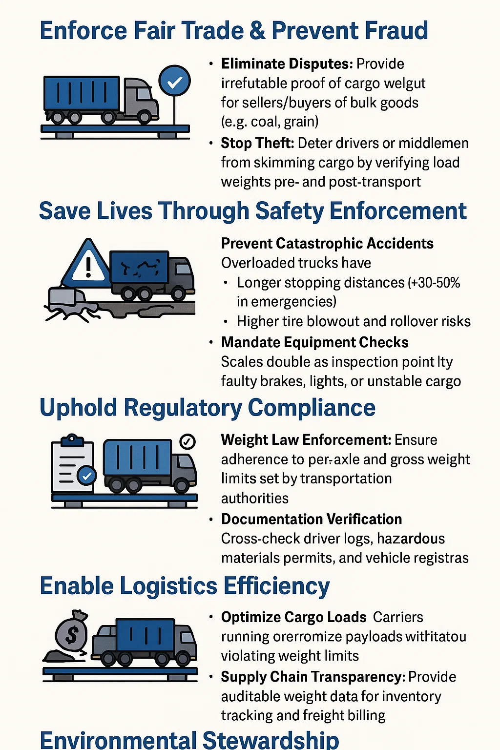 Truck scales exist as critical infrastructure because they resolve fundamental challenges in commerce, safety, and public welfare. Below is a breakdown of their indispensable roles: